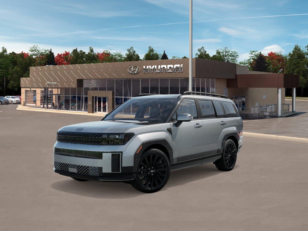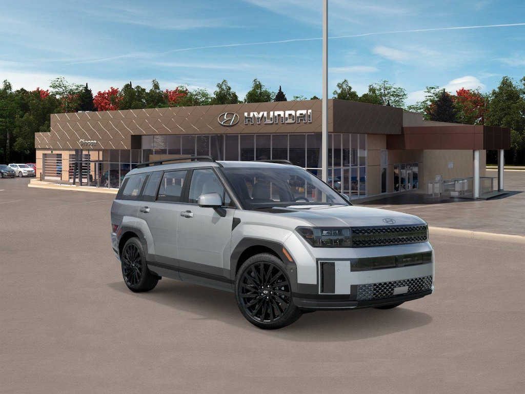 Shimmering Silver 2026 Hyundai Santa Fe Calligraphy AWD 8-Speed Automatic with SHIFTRONIC 2.5L I4 AWD, Gray Leather, 12 Speakers, 3rd row seats: bench, 4-Wheel Disc Brakes, ABS brakes, Air Conditioning, Alloy wheels, AM/FM radio: SiriusXM, Apple CarPlay & Android Auto, Auto High-beam Headlights, Auto-dimming Rear-View mirror, Automatic temperature control, Brake assist, Bumpers: body-color, Cargo Blocks, Cargo Net, Cargo Tray, Carpeted Floor Mats, Delay-off headlights, Driver door bin, Driver vanity mirror, Dual front impact airbags, Dual front side impact airbags, Electronic Stability Control, Emergency communication system, Exterior Parking Camera Rear, First Aid Kit, Four wheel independent suspension, Front anti-roll bar, Front Bucket Seats, Front Center Armrest, Front dual zone A/C, Front reading lights, Fully automatic headlights, Garage door transmitter: HomeLink, Heads-Up Display, Heated and Ventilated Front Bucket Seats, Heated door mirrors, Heated front seats, Heated rear seats, Heated steering wheel, Illuminated entry, Knee airbag, Leather steering wheel, Low tire pressure warning, Memory seat, Navigation System, Occupant sensing airbag, Option Group 01, Outside temperature display, Overhead airbag, Overhead console, Panic alarm, Passenger door bin, Passenger vanity mirror, Power door mirrors, Power driver seat, Power Liftgate, Power moonroof, Power passenger seat, Power steering, Power windows, Quilted Premium Nappa Leather Seat Trim, Radio: AM/FM/HD Bose Premium Audio System, Rain sensing wipers, Rear anti-roll bar, Rear side impact airbag, Rear window defroster, Rear window wiper, Remote keyless entry, Roadside Assistance Kit, Roof Rack Crossbars, Security system, Speed control, Speed-sensing steering, Split folding rear seat, Spoiler, Steering wheel mounted audio controls, Tachometer, Telescoping steering wheel, Tilt steering wheel, Traction control, Trip computer, Turn signal indicator mirrors, Variably intermittent wipers, Ventilated front seats, Wheels: 21" x 8.5J Unique Dark Finish Alloy, AWD, Gray Leather.