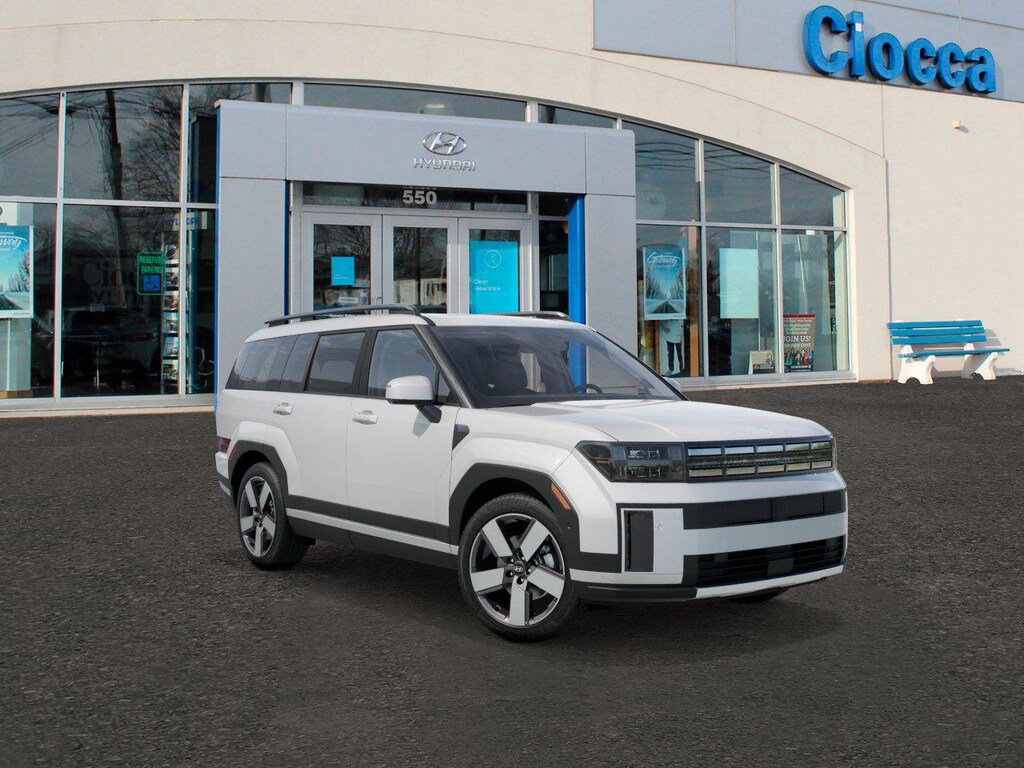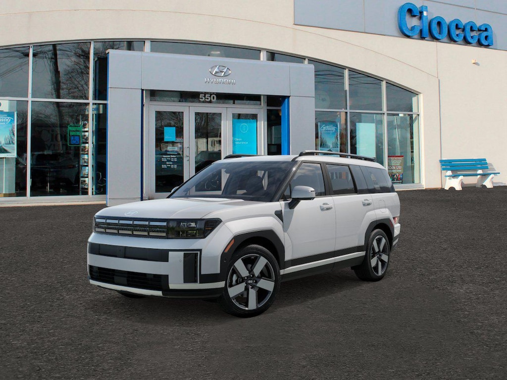 White 2026 Hyundai Santa Fe Limited AWD 8-Speed Automatic with SHIFTRONIC 2.5L I4 AWD, Black Leather, 12 Speakers, 3rd row seats: bench, 4-Wheel Disc Brakes, ABS brakes, Air Conditioning, Alloy wheels, AM/FM radio: SiriusXM, Apple CarPlay & Android Auto, Auto High-beam Headlights, Auto-dimming Rear-View mirror, Automatic temperature control, Brake assist, Bumpers: body-color, Cargo Net, Cargo Tray, Carpeted Floor Mats, Delay-off headlights, Driver door bin, Driver vanity mirror, Dual front impact airbags, Dual front side impact airbags, Electronic Stability Control, Emergency communication system, Exterior Parking Camera Rear, First Aid Kit, Four wheel independent suspension, Front anti-roll bar, Front Bucket Seats, Front Center Armrest, Front dual zone A/C, Front reading lights, Fully automatic headlights, Garage door transmitter: HomeLink, Heated and Ventilated Front Bucket Seats, Heated door mirrors, Heated front seats, Heated rear seats, Heated steering wheel, Illuminated entry, Knee airbag, Leather Seat Trim, Leather steering wheel, Low tire pressure warning, Memory seat, Navigation System, Occupant sensing airbag, Outside temperature display, Overhead airbag, Overhead console, Panic alarm, Passenger door bin, Passenger vanity mirror, Power door mirrors, Power driver seat, Power Liftgate, Power moonroof, Power passenger seat, Power steering, Power windows, Radio: AM/FM/HD Bose Premium Audio System, Rain sensing wipers, Rear anti-roll bar, Rear side impact airbag, Rear window defroster, Rear window wiper, Remote keyless entry, Roadside Assistance Kit, Roof Rack Crossbars, Security system, Speed control, Speed-sensing steering, Split folding rear seat, Spoiler, Steering wheel mounted audio controls, Tachometer, Telescoping steering wheel, Tilt steering wheel, Traction control, Trip computer, Turn signal indicator mirrors, Variably intermittent wipers, Ventilated front seats, Wheels: 20" x 8.5J Alloy, AWD, Black Leather.