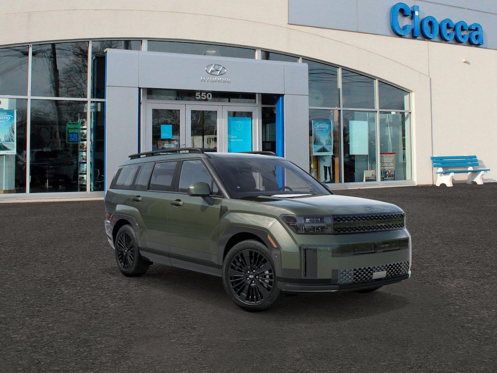 Green 2026 Hyundai Santa Fe Hybrid Calligraphy AWD 6-Speed Automatic with Shiftronic I4 I4, 12 Speakers, 3rd row seats: bench, 4-Wheel Disc Brakes, ABS brakes, Air Conditioning, Alloy wheels, AM/FM radio: SiriusXM, Apple CarPlay & Android Auto, Auto High-beam Headlights, Auto-dimming Rear-View mirror, Automatic temperature control, Brake assist, Bumpers: body-color, Cargo Cover/Screen, Cargo Net, Cargo Organizer, Cargo Tray, Carpeted Floor Mats, Delay-off headlights, Driver door bin, Driver vanity mirror, Dual front impact airbags, Dual front side impact airbags, Electronic Stability Control, Emergency communication system, Exterior Parking Camera Rear, First Aid Kit, Four wheel independent suspension, Front anti-roll bar, Front Bucket Seats, Front Center Armrest, Front dual zone A/C, Front reading lights, Fully automatic headlights, Garage door transmitter: HomeLink, Heads-Up Display, Heated and Ventilated Front Bucket Seats, Heated door mirrors, Heated front seats, Heated rear seats, Heated steering wheel, Illuminated entry, Knee airbag, Leather steering wheel, Low tire pressure warning, Memory seat, Navigation System, Occupant sensing airbag, Option Group 01, Outside temperature display, Overhead airbag, Overhead console, Panic alarm, Passenger door bin, Passenger vanity mirror, Power door mirrors, Power driver seat, Power Liftgate, Power moonroof, Power passenger seat, Power steering, Power windows, Quilted Premium Nappa Leather Seat Trim, Radio: AM/FM/HD Bose Premium Audio System, Rain sensing wipers, Rear anti-roll bar, Rear side impact airbag, Rear window defroster, Rear window wiper, Remote keyless entry, Roadside Assistance Kit, Security system, Speed control, Speed-sensing steering, Split folding rear seat, Spoiler, Steering wheel mounted audio controls, Tachometer, Telescoping steering wheel, Tilt steering wheel, Traction control, Transverse Panel, Trip computer, Turn signal indicator mirrors, Variably intermittent wipers, Ventilated front seats, Wheels: 20" x 8.5J Unique Dark Finish Alloy, I4.